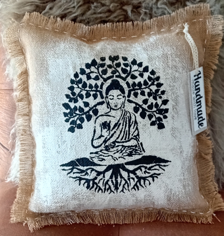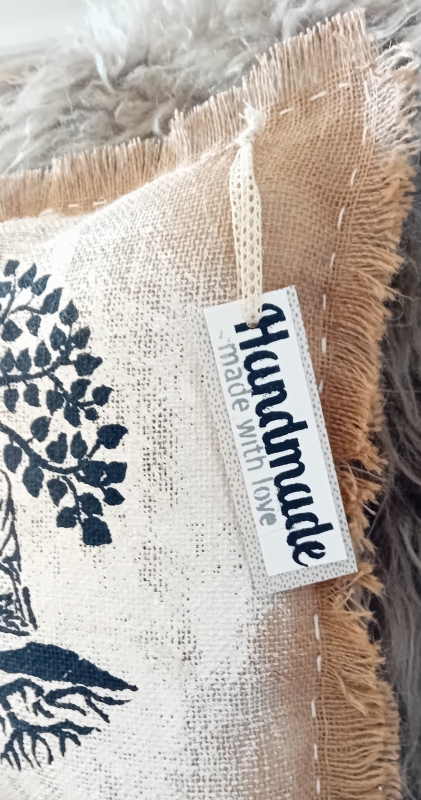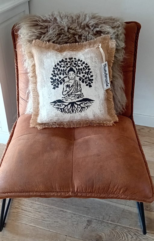 Een uniek handgemaakt kussen van jute stof met geschilderde print.