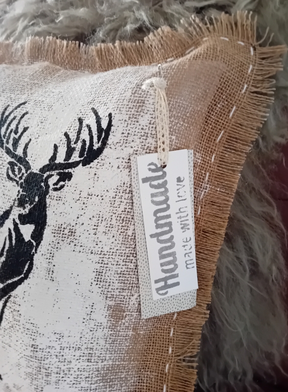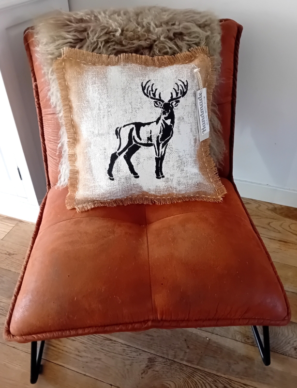 Een uniek handgemaakt kussen van jute.