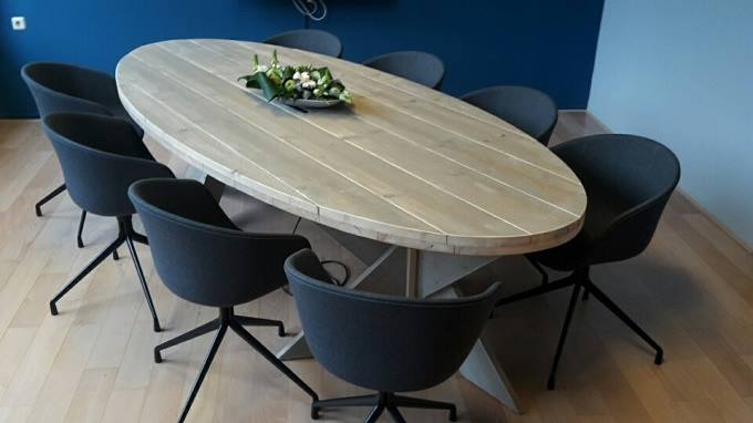 Vergadertafel steigerhout ovaal met stalen midden kruispoot