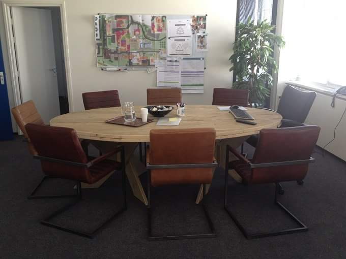 Steigerhouten ovalen vergadertafel met stalen kruis poot. Of 2x houten kruis.