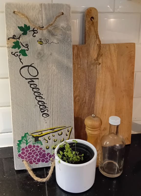 De steigerhouten hapjesplank is op maat gezaagd. +/- 50 cm lang.