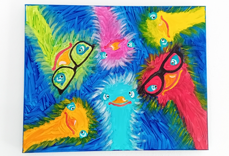 Tijdens deze leuke workshop schilder jij een paneel van 50x40 vol met grappige struisvogels.